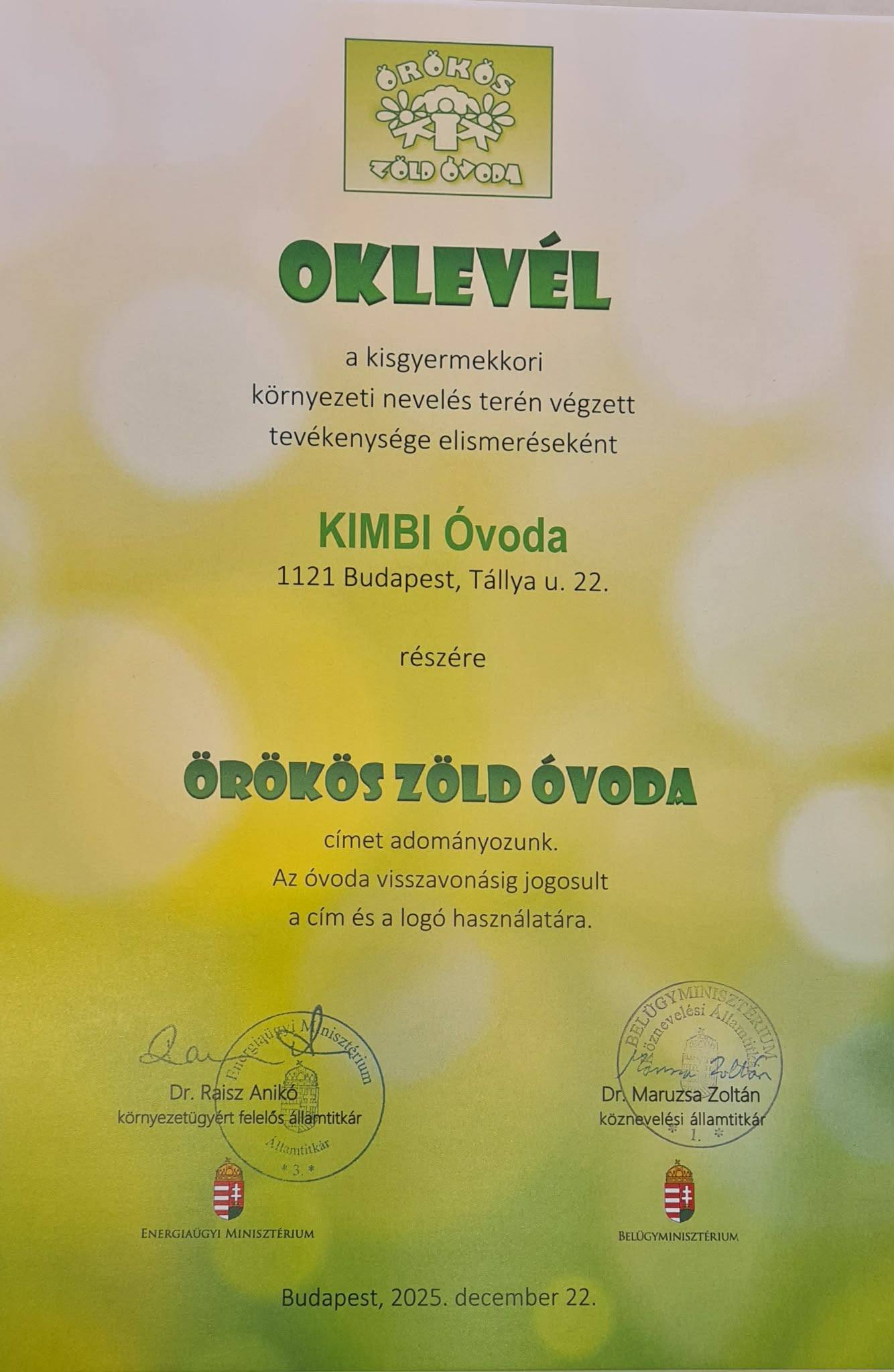 Óvodánk elnyerte az Örökös Zöld Óvoda címet! Hosszú és kitartó munka gyümölcse ez az elismerés. Már 2013 óta büszkén viseljük a Zöld Óvoda nevet, és azóta is elkötelezetten neveljük a gyerekeket a környezettudatosságra, a természet szeretetére és megóvására. Idén különösen ünnepi ez a pillanat, hiszen a Zöld Óvoda program éppen a 20. évfordulóját ünnepli! Hatalmas megtiszteltetés, hogy részesei lehetünk ennek a nagyszerű mozgalomnak, és mostantól az Örökös Zöld Óvodák táborát erősíthetjük.